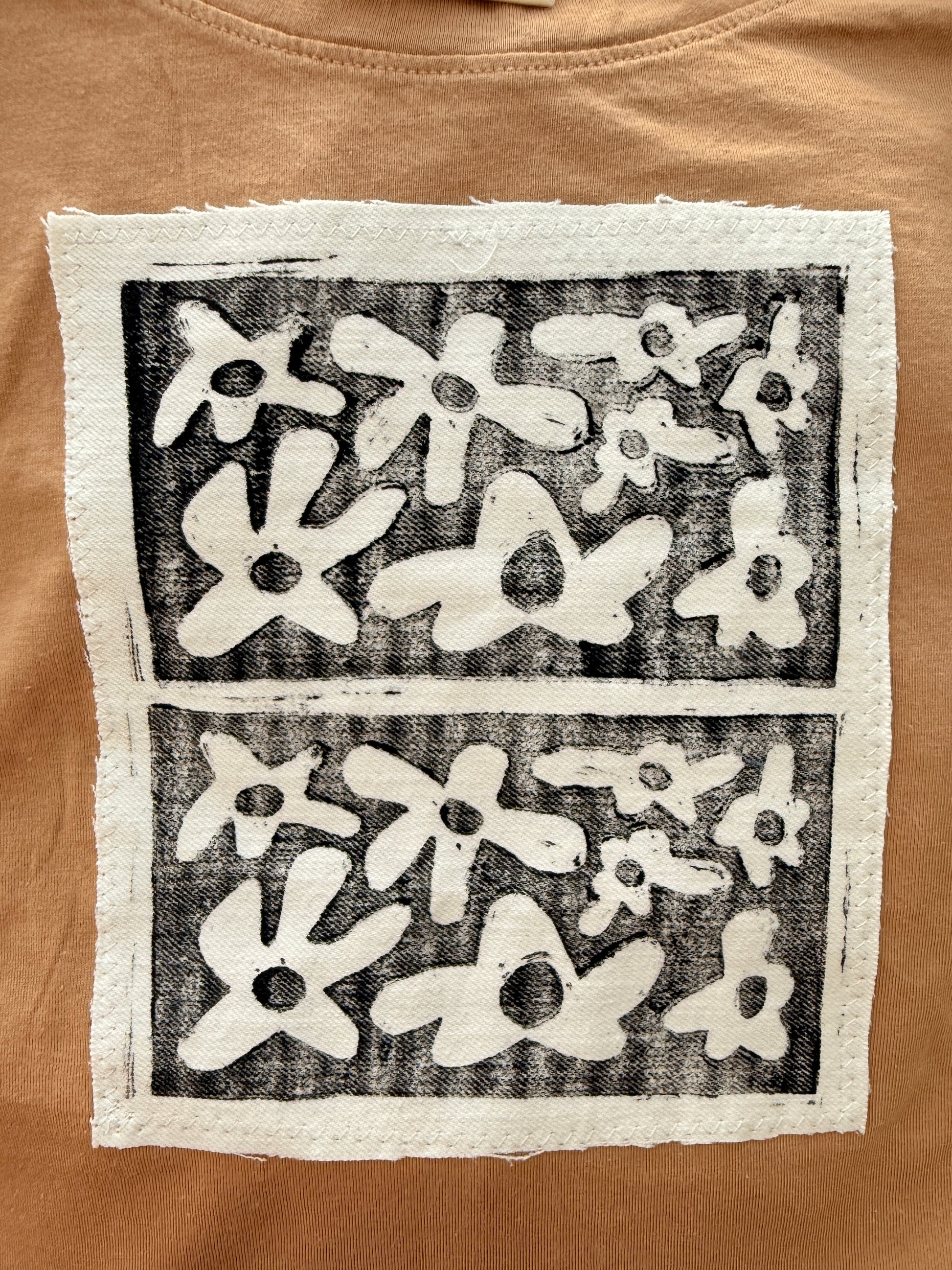 This one-of-a-kind tee was made using a thrifted tee and hand-stamped denim patch, designed with a custom linocut stamp I carved myself. A wearable piece of art that gives new life to old materials—made with love and purpose.